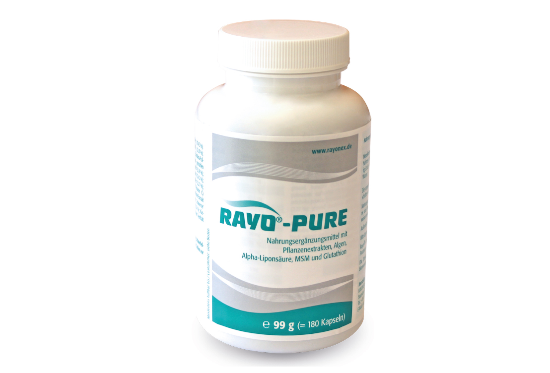 Rayo®-Pure is a premium supplement formulated with plant extracts, algae, alpha-lipoic acid, MSM, and glutathione. Each bottle contains 180 capsules (99g).